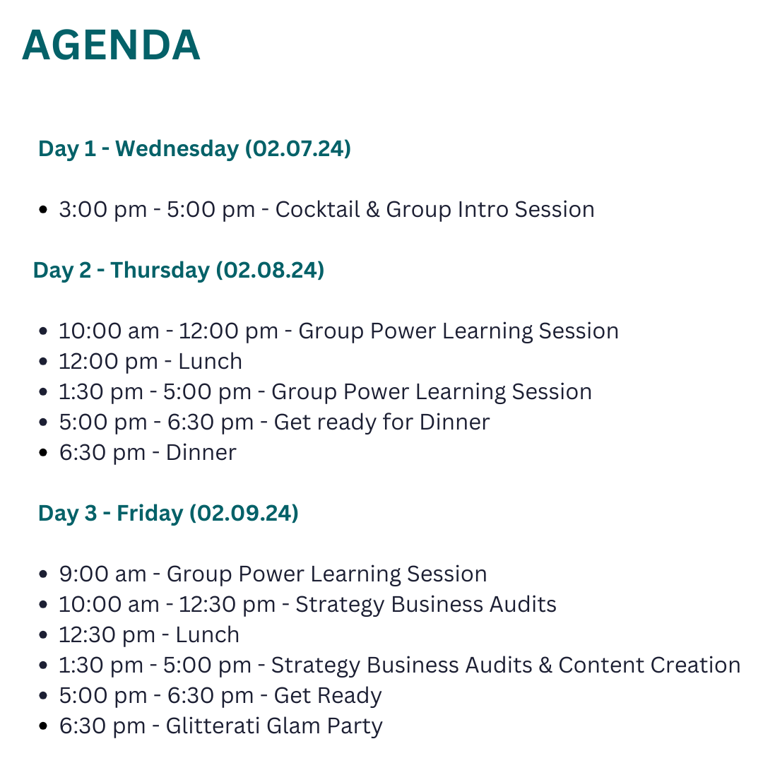 What’s Included: All dinners and cocktails, along with professional photography to capture your best moments. Coffee/beverages will be provided in the afternoon collaboration sessions. Your travel expenses are NOT included. Upon enrolling in The Mastermind , you’ll receive an email with location and hotel information so that you can plan appropriately.